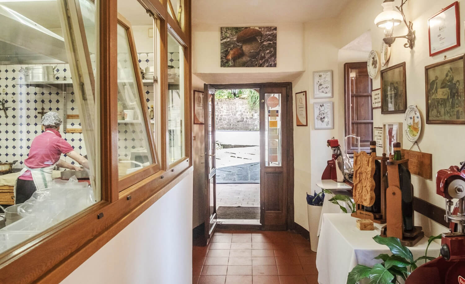Ambiente semplice e familiare, con una suggestiva saletta panoramica. La specialità indiscussa sono i funghi fritti, considerati da molti una tappa obbligata. Completano l’offerta piatti di cacciagione, carni alla griglia e, nel periodo giusto, proposte al tartufo.